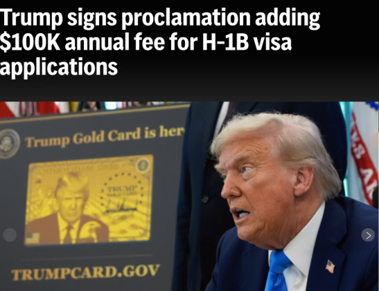 當?shù)貢r間9月19日,特朗普政府宣布對H-1B工作簽證實施嚴格限制,新增高達10萬美元的申請費,并要求雇主為入境申請人承擔(dān)這筆費用!